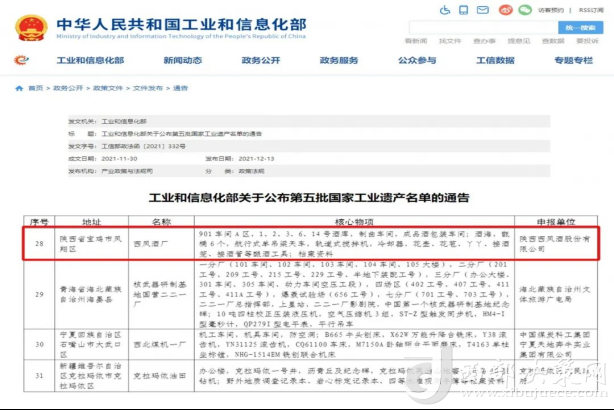 西部决策网讯(韩宗宪)12月13日,工业和信息化部公布了第五批国家工业遗产名单,西凤酒酿酒工业遗产群作为唯一的中国白酒生产酿造项目同全国其他30家工业遗产一起进入名单。这也是继6月10日国家级非物质文化遗产榜单发布以来,西凤荣列的又一重磅国家级名单。既标志了相关部门和广大消费者对三千年无断代西凤酒酿造设备和酿造技艺的肯定,也表示出西凤酒为中国白酒发展作出的突出贡献。
