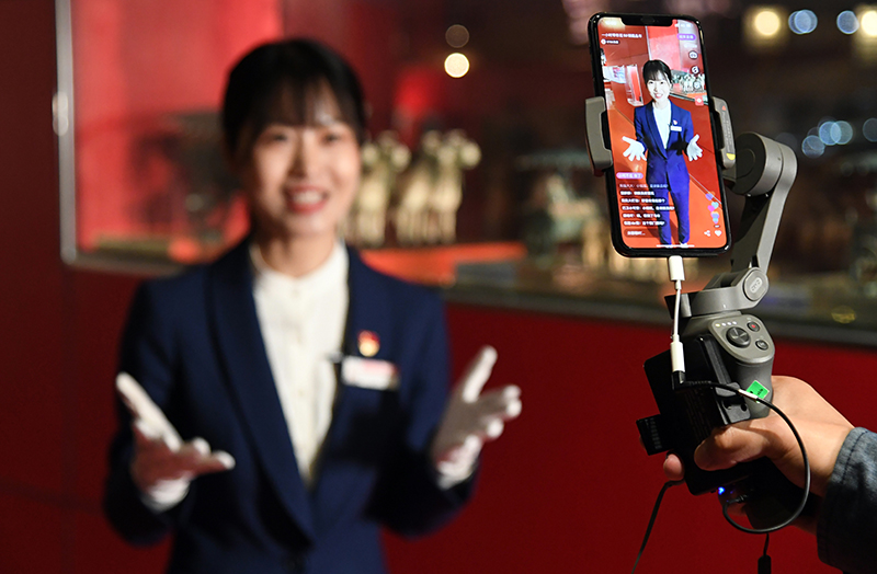 2020年4月30日,在北京汽车博物馆,讲解员曾红娟通过网络直播平台为观众介绍馆内的藏品车。