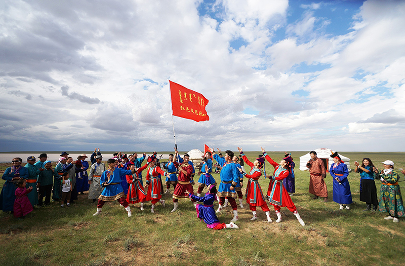 2018年8月22日,内蒙古苏尼特右旗乌兰牧骑队员在牧区演出。