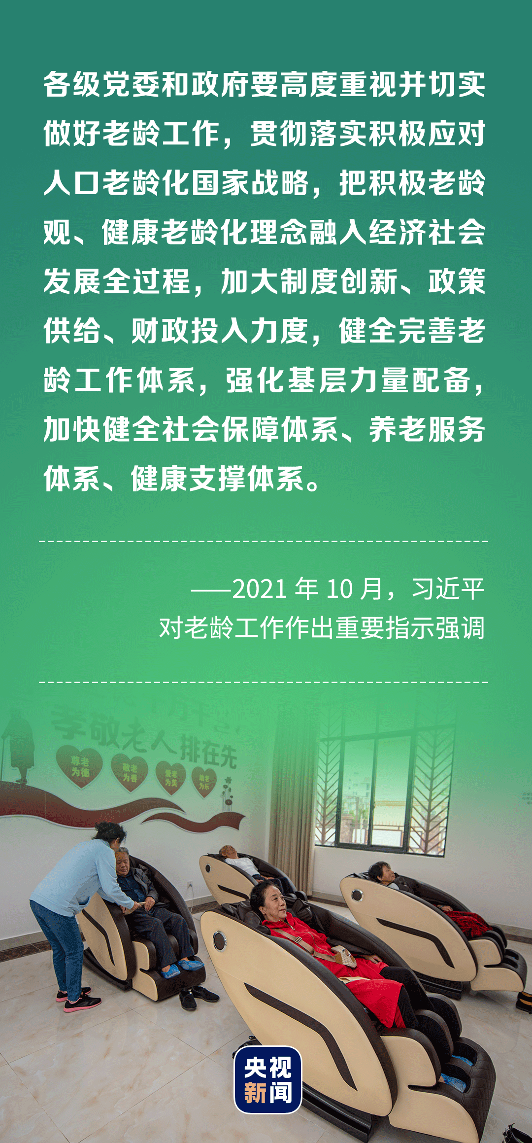 今年10月,在中国传统节日重阳节来临前,习近平总书记代表党中央祝全国老年人健康长寿、生活幸福。他强调,要大力弘扬孝亲敬老传统美德,落实好老年优待政策,维护好老年人合法权益,发挥好老年人积极作用,让老年人共享改革发展成果、安享幸福晚年。