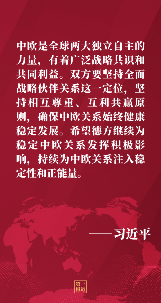 习近平强调,中欧是全球两大独立自主的力量,有着广泛战略共识和共同利益。双方要坚持全面战略伙伴关系这一定位,坚持相互尊重、互利共赢原则,确保中欧关系始终健康稳定发展。希望德方继续为稳定中欧关系发挥积极影响,持续为中欧关系注入稳定性和正能量。