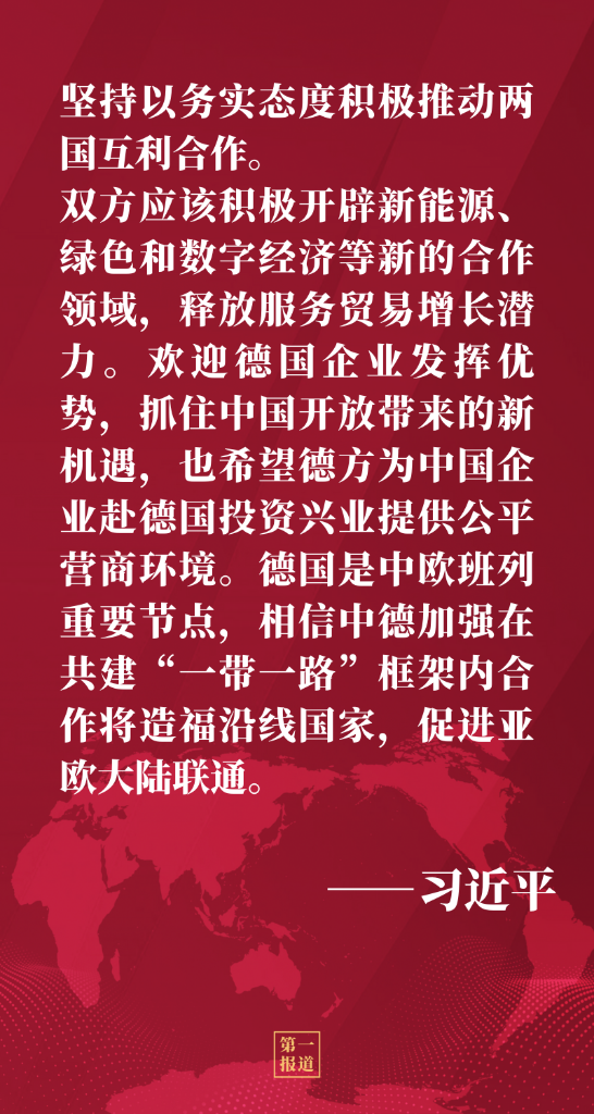 持续深化务实合作,是推动中德关系不断破浪前行的“主引擎”。中德都致力于在平等互利基础上扩大双方共同利益。2020年以来,中德两国努力克服疫情影响,推动双方各领域合作总体保持积极向好发展势头,双边经贸合作实现逆势增长。中国已连续5年成为德国最大贸易伙伴。面向未来,双方应该继续把牢互利合作的主基调,推动中德合作继续走深走实。双方应继续用好政府磋商等双边对话交流机制,做大做强合作基本盘,积极开辟新能源、绿色和数字经济等新的合作领域,释放服务贸易增长潜力,加强在共建“一带一路”框架内合作。德方也表示希望与中国加强清洁能源、数字经济、服务业等领域务实合作。