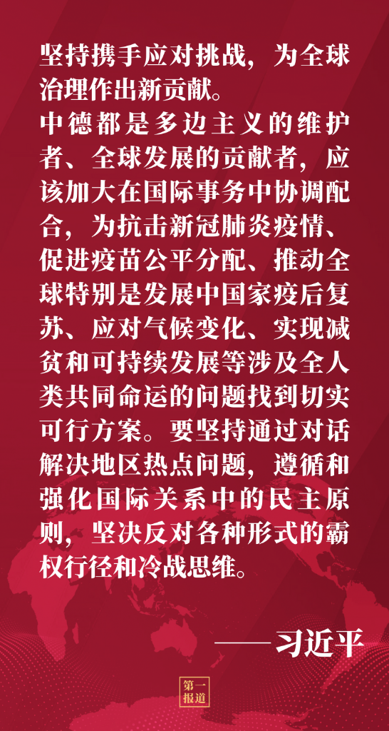 第三,坚持携手应对挑战,为全球治理作出新贡献。中德都是多边主义的维护者、全球发展的贡献者,应该加大在国际事务中协调配合,为抗击新冠肺炎疫情、促进疫苗公平分配、推动全球特别是发展中国家疫后复苏、应对气候变化、实现减贫和可持续发展等涉及全人类共同命运的问题找到切实可行方案。要坚持通过对话解决地区热点问题,遵循和强化国际关系中的民主原则,坚决反对各种形式的霸权行径和冷战思维。各国一起发展才是真发展。中方愿同德方携手推动落实联合国2030年可持续发展议程。