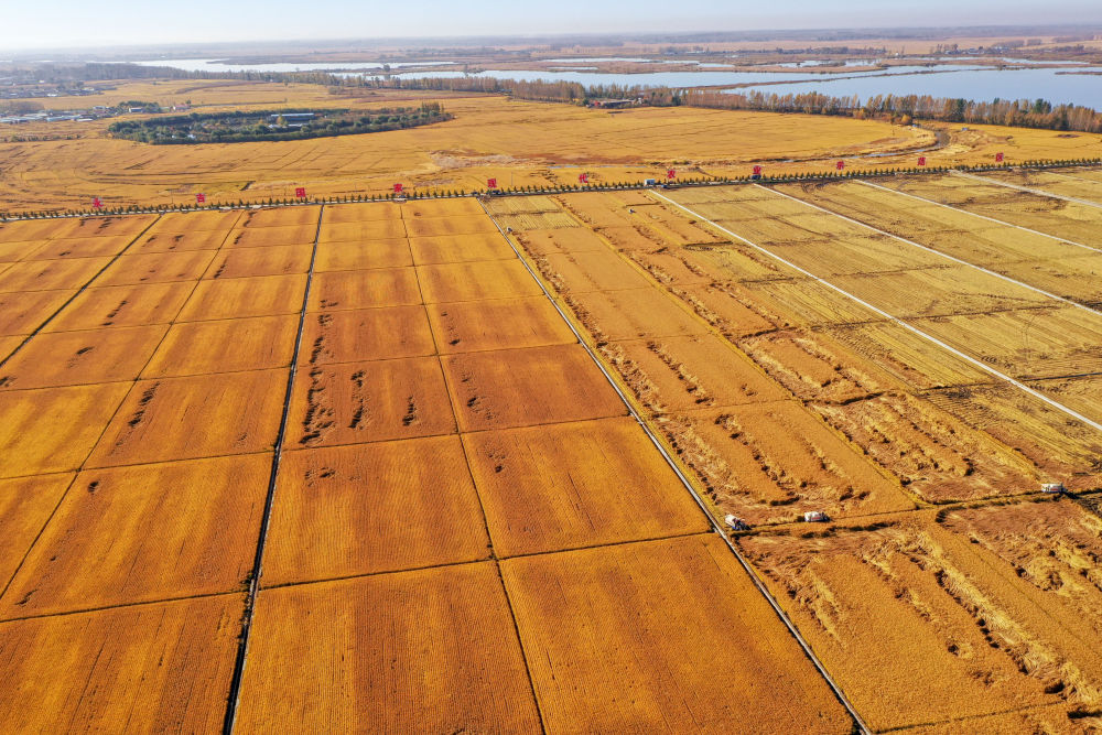 在吉林省吉林市永吉县万昌镇,农民驾驶农机收割水稻(2021年10月12日摄,无人机照片)。新华社记者 张楠 摄