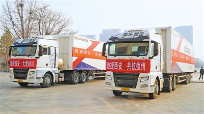 1月6日16时,5辆悬挂爱心标语、满载爱心物资的货车,从银川市行政中心出发驶向西安。据了解,这些物资最快将在1月7日运达西安市。