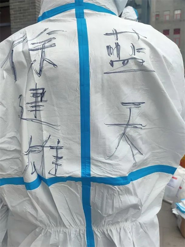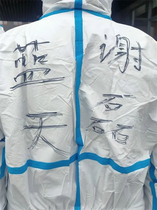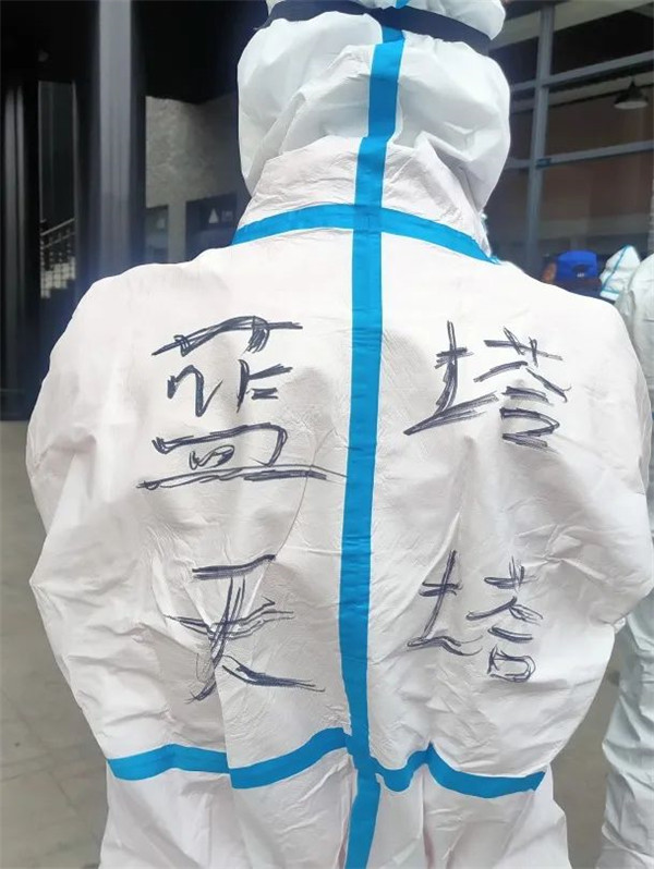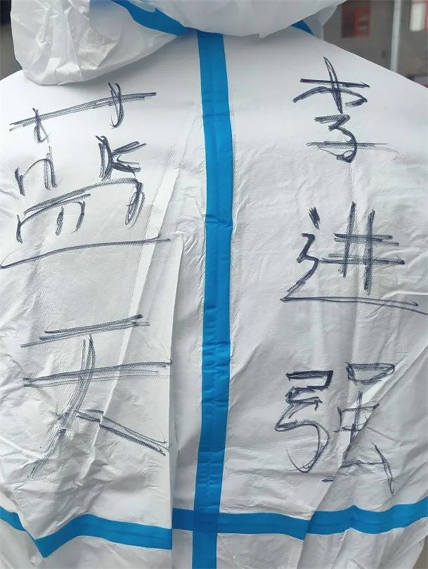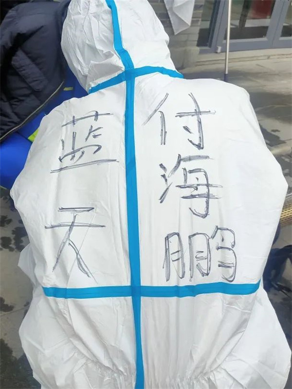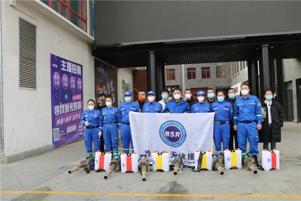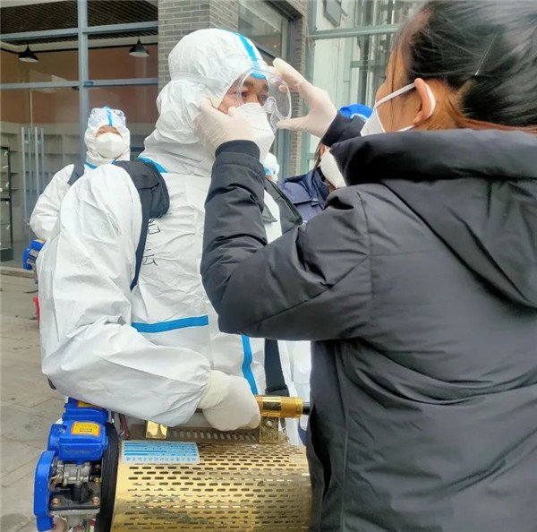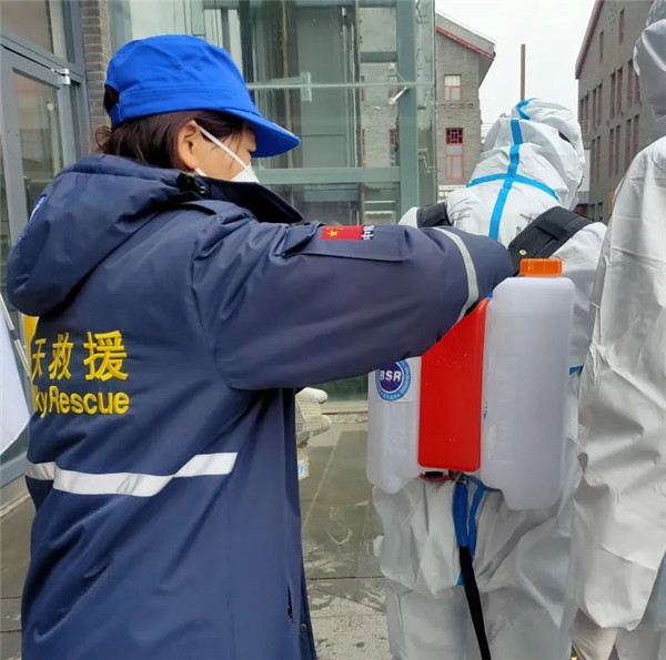 榆林蓝天救援队迅速穿戴好防护服准备就绪,队友们互相对照检查防护服穿着是否规范、弥雾机佩戴是否安全、消杀区域的配合等事项。