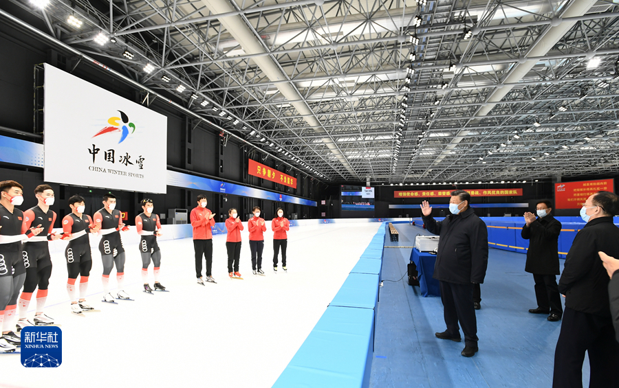 2022年1月4日,中共中央总书记、国家主席、中央军委主席习近平在北京考察2022年冬奥会、冬残奥会筹办备赛工作。这是4日下午,习近平在二七厂冰雪项目训练基地速滑馆,向参训运动员、教练员表示慰问。新华社记者 谢环驰 摄
