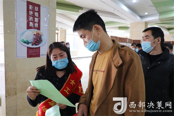 在山阳煤矿职工食堂里,大家都正在忙碌着打饭,但有一个画面却温暖着每一个人的心窝,记者用镜头捕捉到这样一幅画面,身为家属协管员的赵翠芝,给每一位进来的职工发放疫情知识宣传单,并耐心的给她们讲解其中的内容以及疫情防护注意事项。