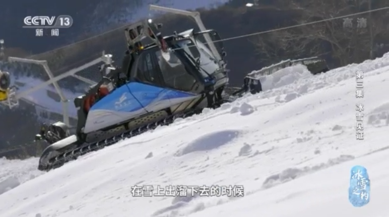 压雪车,十几吨重,巨大的绞盘和缆绳牵引着,在倾斜度接近30度的坡面上完成压雪工作。赛道上还常有近45度角的急转弯。