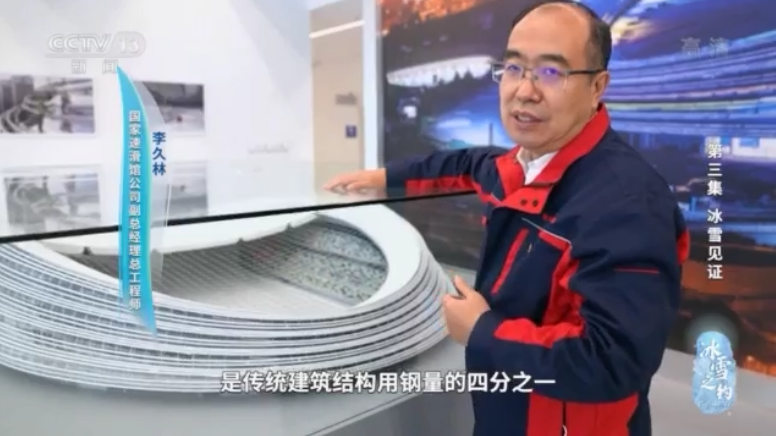 国家速滑馆公司副总经理、总工程师 李久林:通过张拉这个索,就像做网球拍一样,只用了几百吨的钢丝就可以实现大型体育场馆的屋顶,是传统建筑结构用钢量的四分之一。