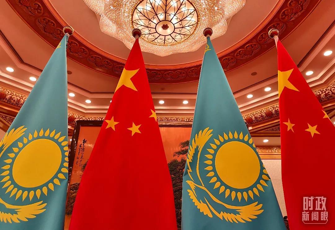 △2月5日上午,会谈现场摆放的中哈两国国旗。(总台央视记者杨立峰拍摄)