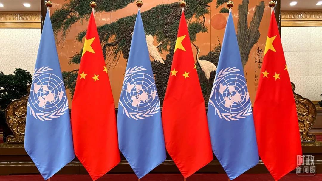 △会谈现场的联合国旗帜与五星红旗。(总台央视记者段德文拍摄)