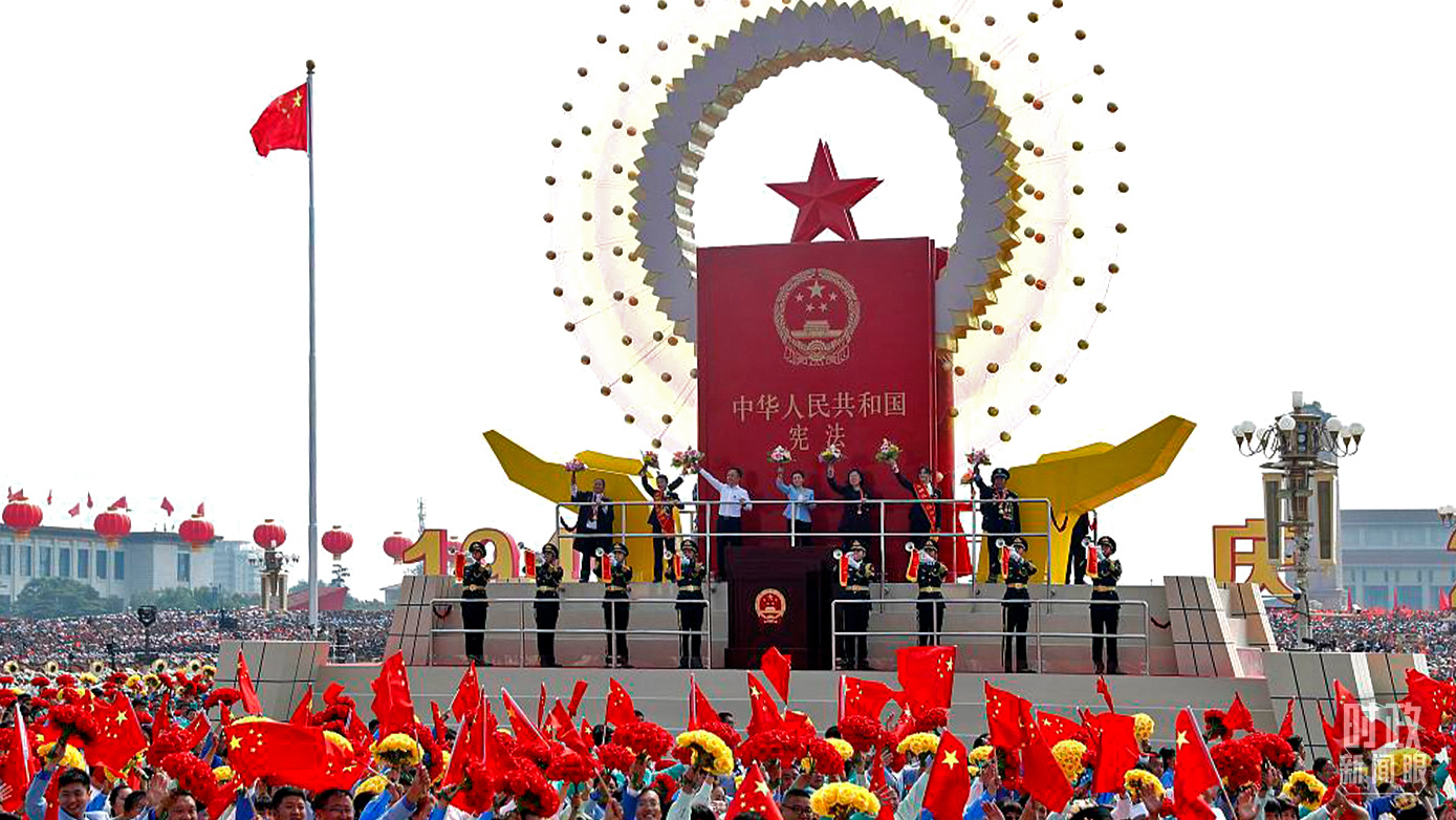 △2019年10月1日,庆祝中华人民共和国成立70周年大会现场,这是群众游行中的“民主法治”方阵。(图/视觉中国)