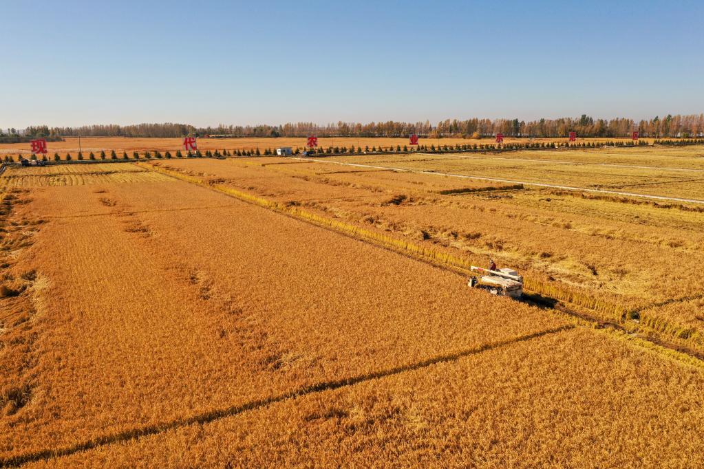 2021年10月12日,在吉林省吉林市永吉县万昌镇,农民驾驶农机收割水稻(无人机照片)。新华社记者 张楠 摄