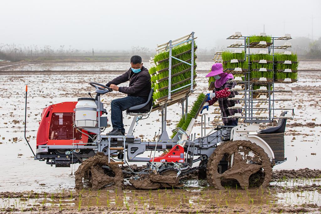 △2022年3月,浙江省温岭市一家庭农场,农民驾驶钵苗摆栽机进行作业。