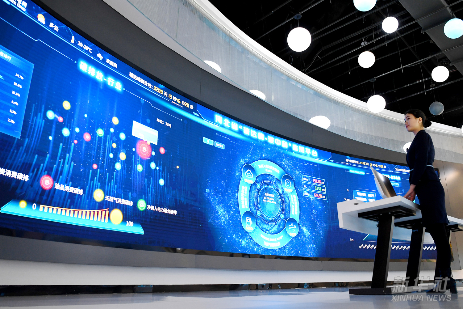 位于雄安新区首座新建220千伏变电站——剧村站内的“碳达峰、碳中和”监测平台,通过电力大数据折算碳排放量,对雄安新区碳排放、碳减排、碳汇进行实时监测分析(2022年3月18日摄)。