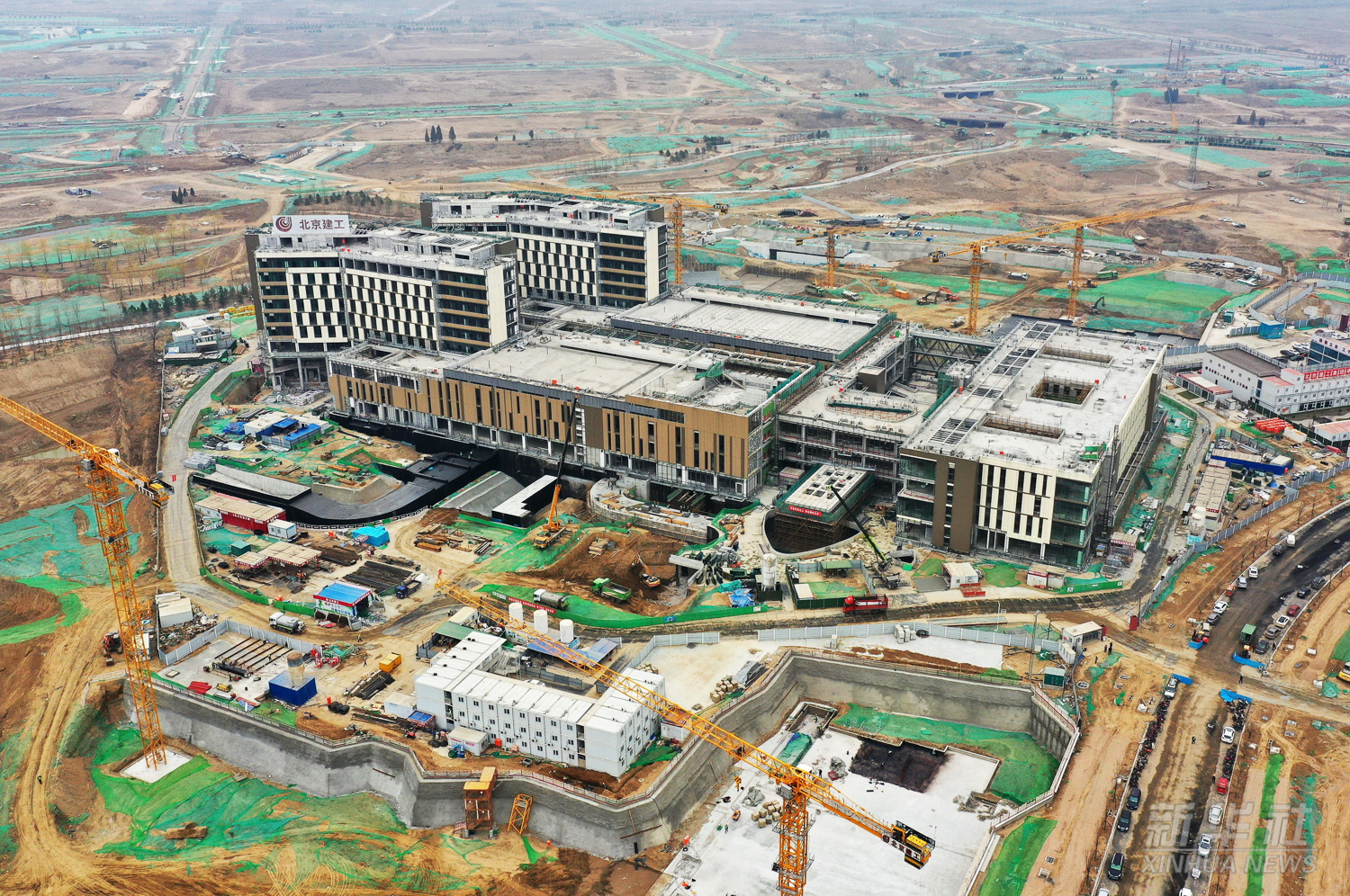 这是雄安新区首家三甲医院——首都医科大学宣武医院雄安院区项目建设施工现场(无人机照片,2022年3月29日摄)。该工程由北京市援建,总建筑面积12.2万平方米,包括门诊楼、医技楼、住院楼、科研楼等,主体结构于2021年8月封顶,建成后将成为拥有600张床位的独立运行三级甲等医院。