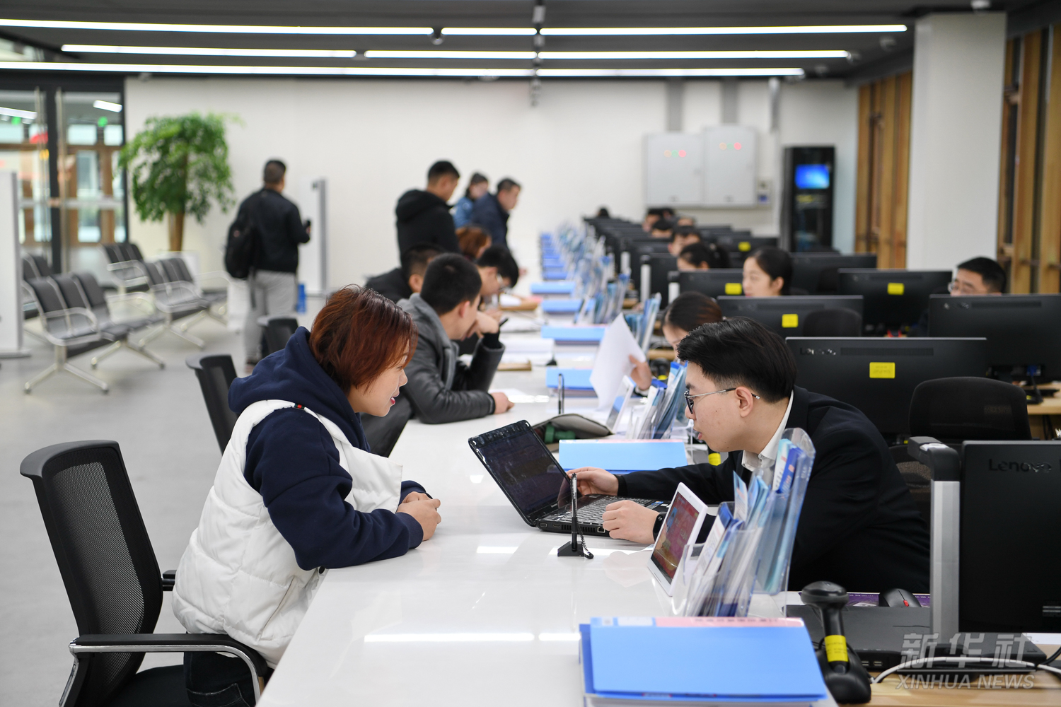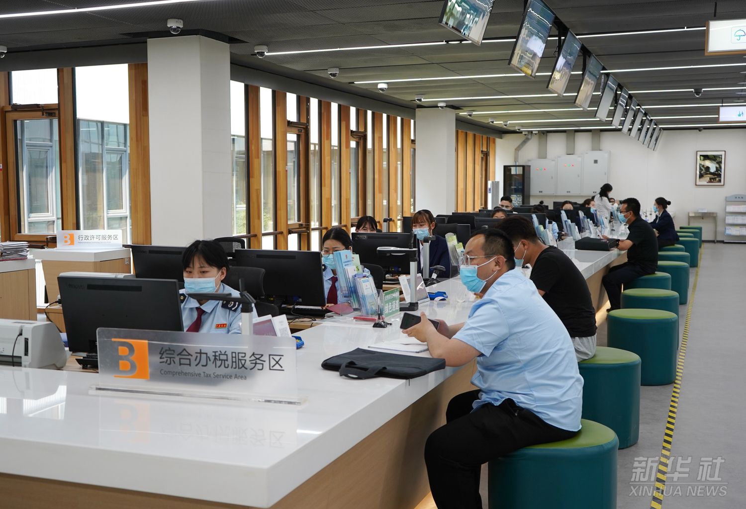 工作人员在河北雄安新区政务服务中心综合办税服务区为居民办理业务(2021年5月12日摄)。雄安新区政务服务中心成立于2018年5月30日,为企业和个人提供“一站式”行政审批事项受理和便民业务受理。