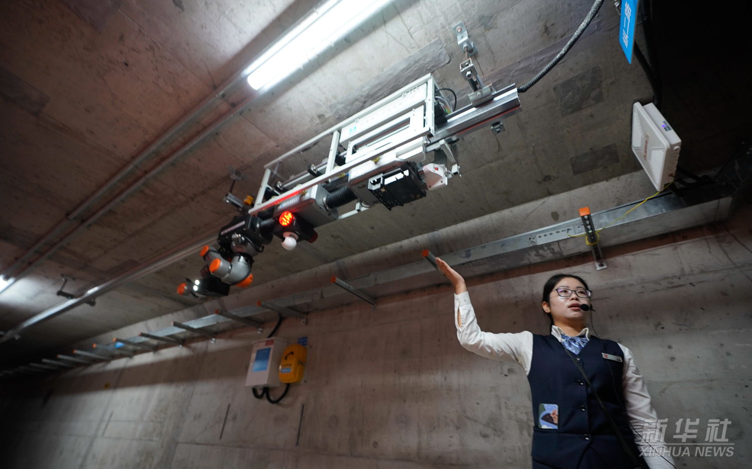 工作人员在介绍雄安新区市民服务中心地下管廊(2019年8月30日摄)。在雄安新区,水、电、气、暖、网等市政配套基础设施管线全都集纳在地下综合管廊中,设有专门的检修口、吊装口和监测系统,实施统一规划、统一设计、统一建设和管理,充分体现了创新引领和高质量发展理念。