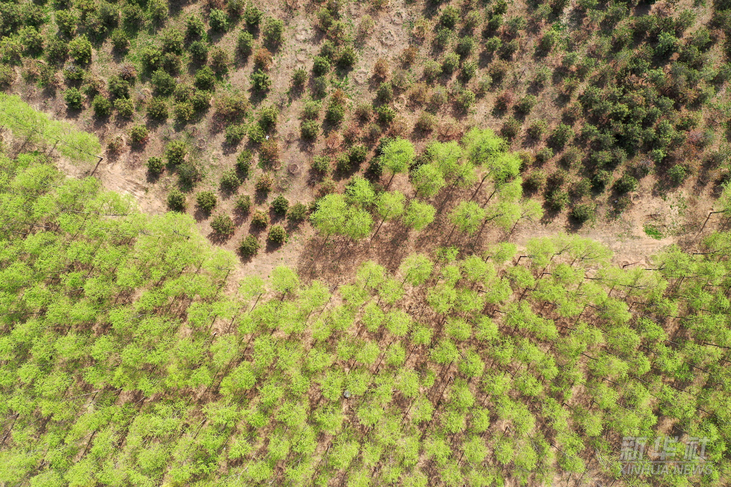 雄安新区“千年秀林”(无人机照片,2021年3月31日摄)。截至2022年3月,雄安新区森林覆盖率已超过30%。根据规划,雄安未来蓝绿空间占比稳定在70%。