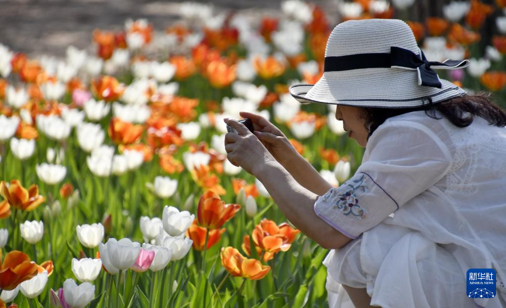 4月19日,游人在北臧村镇永定河畔的绿色港湾内拍摄盛开的郁金香。