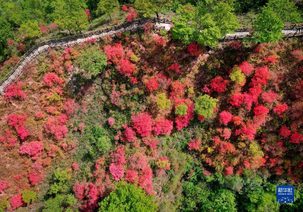 4月20日拍摄的河南省汝阳县付店镇西泰山景区内盛开的杜鹃花(无人机照片)。新华社记者 李安 摄