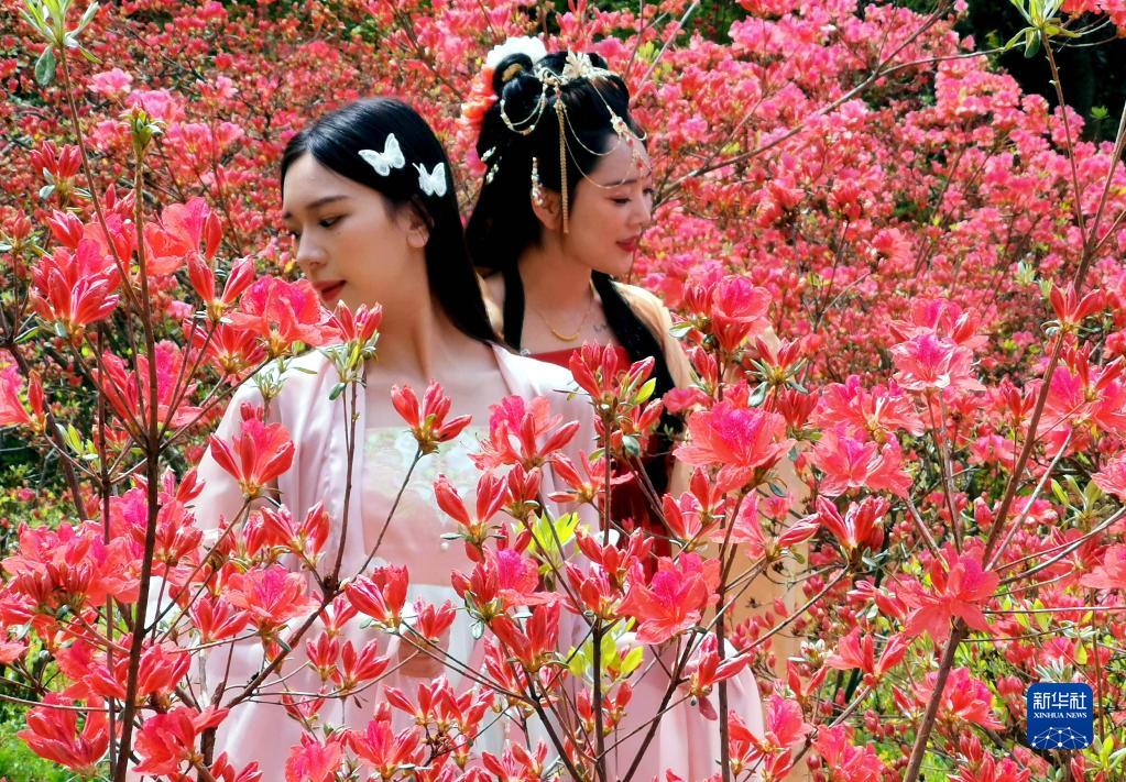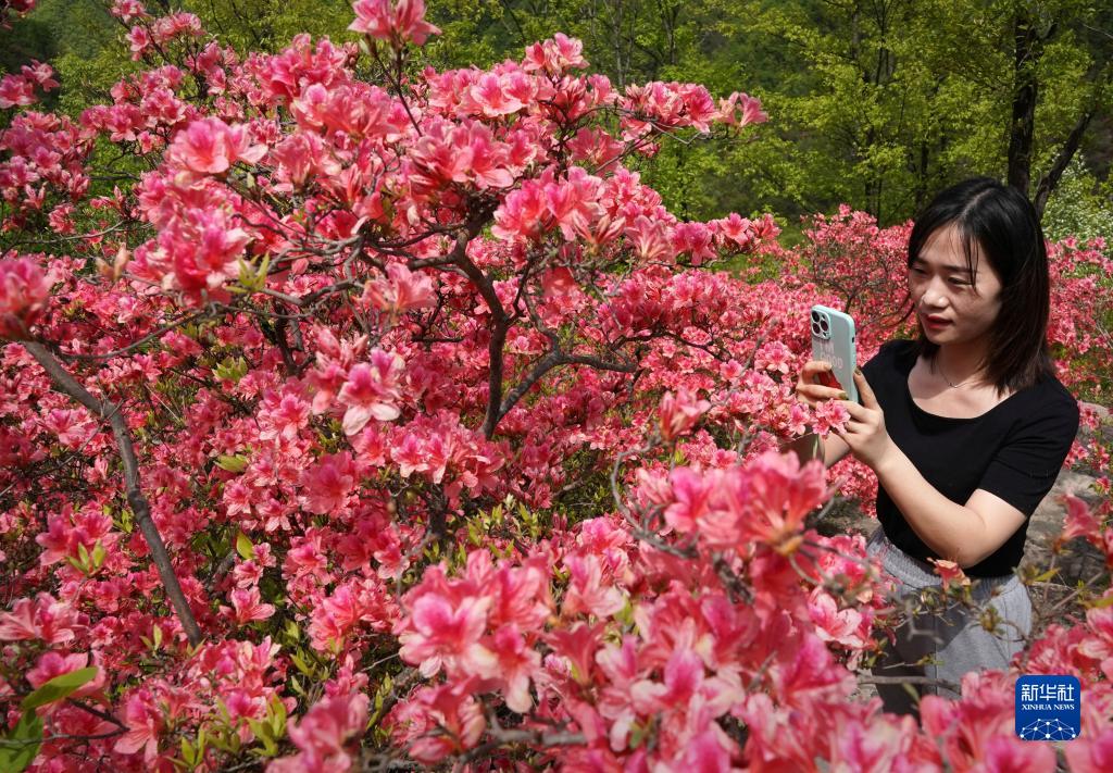 游客在河南省汝阳县付店镇西泰山景区内拍摄盛开的杜鹃花(4月20日摄)。新华社记者 李安 摄