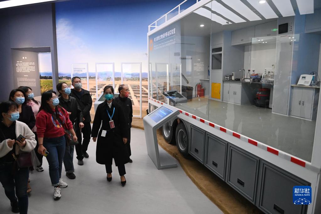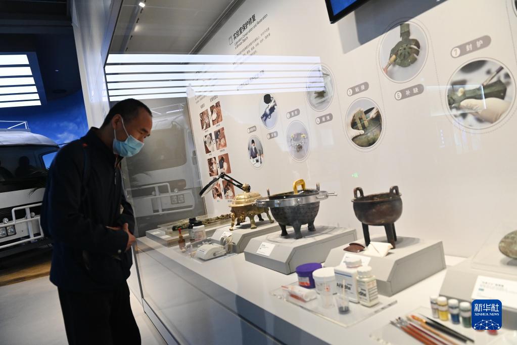 4月28日,游客在陕西考古博物馆内参观考古现场文物保护移动实验室。新华社记者 李一博 摄