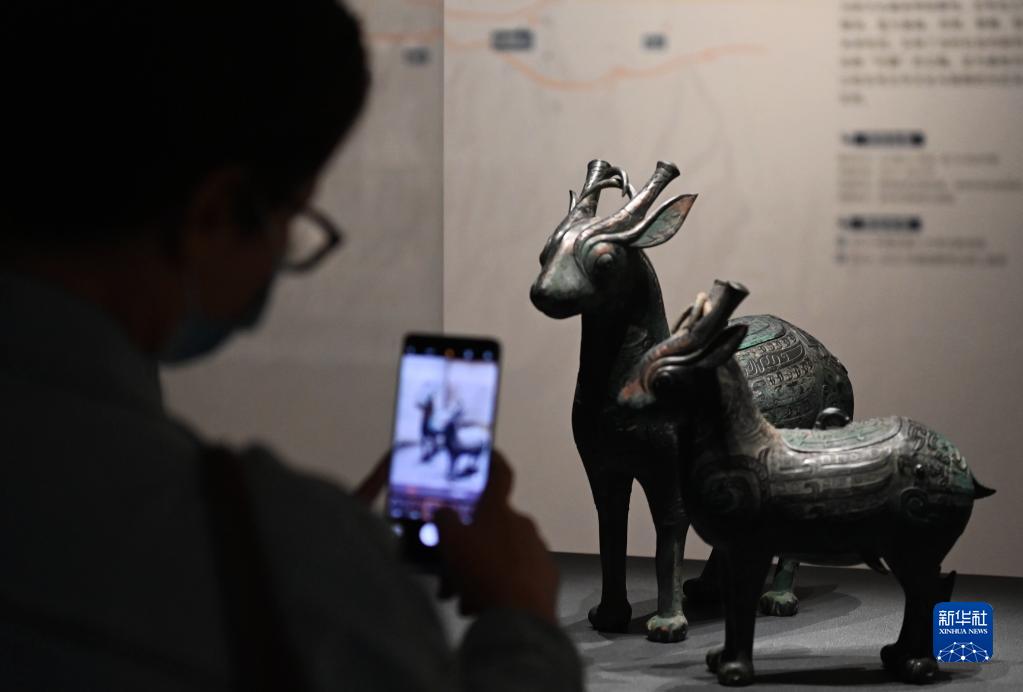 4月28日,游客在陕西考古博物馆内参观宝鸡石鼓山商周墓地出土的牺尊。新华社记者 李一博 摄