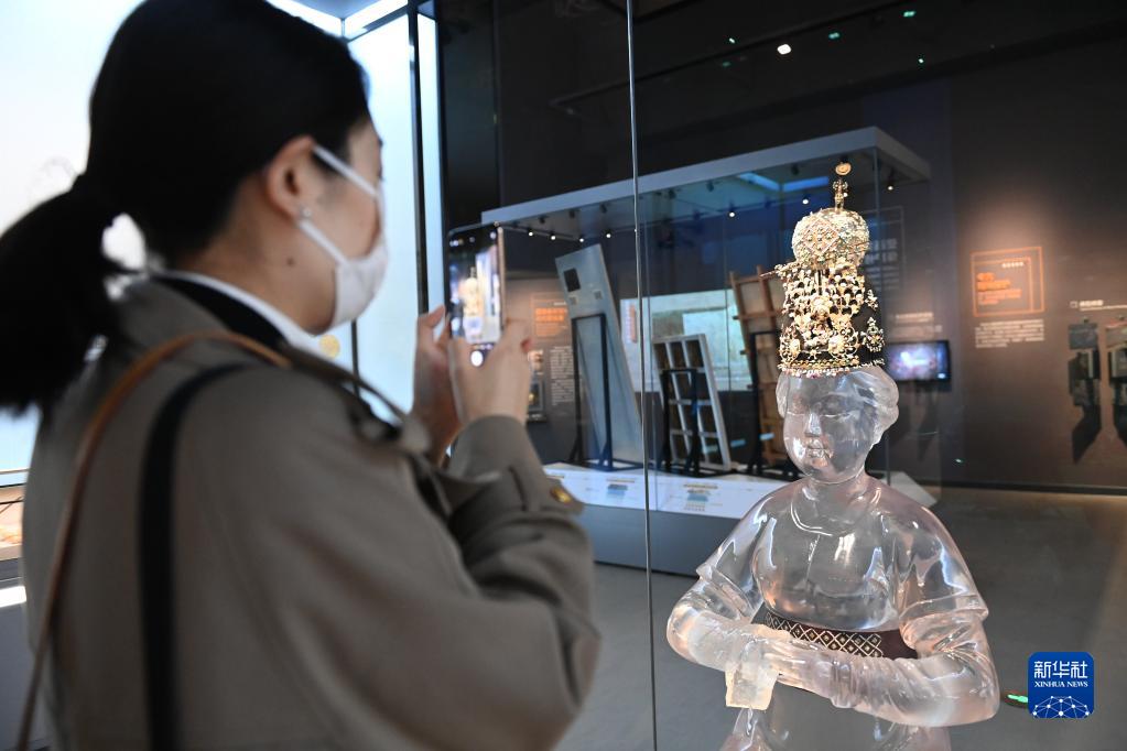 4月28日,游客在陕西考古博物馆内拍摄唐代李倕冠饰。新华社记者 李一博 摄