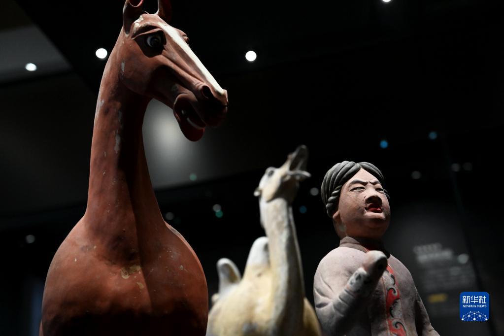 这是陕西考古博物馆展出的唐代彩绘陶牵马俑及马(4月28日摄)。新华社记者 李一博 摄