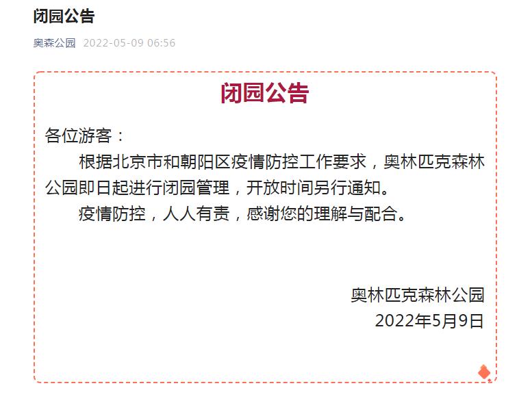 “奥森公园”微信公众号9日发布闭园公告,根据北京市和朝阳区疫情防控工作要求,奥林匹克森林公园即日起进行闭园管理,开放时间另行通知。