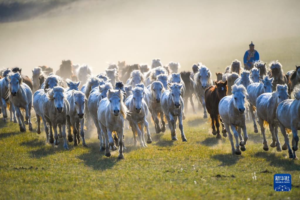 初夏时节,内蒙古锡林郭勒盟西乌珠穆沁旗的草原开始返青。当地牧民赶着马匹,来到草原上驯马,景象壮观。