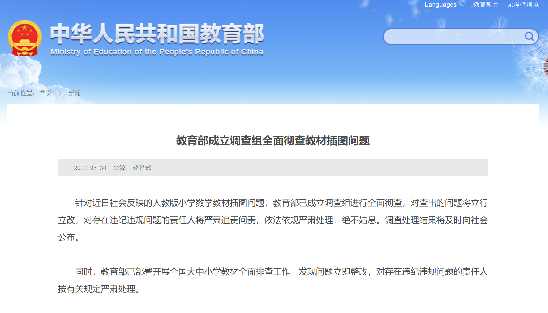 同时,教育部已部署开展全国大中小学教材全面排查工作,发现问题立即整改,对存在违纪违规问题的责任人按有关规定严肃处理。