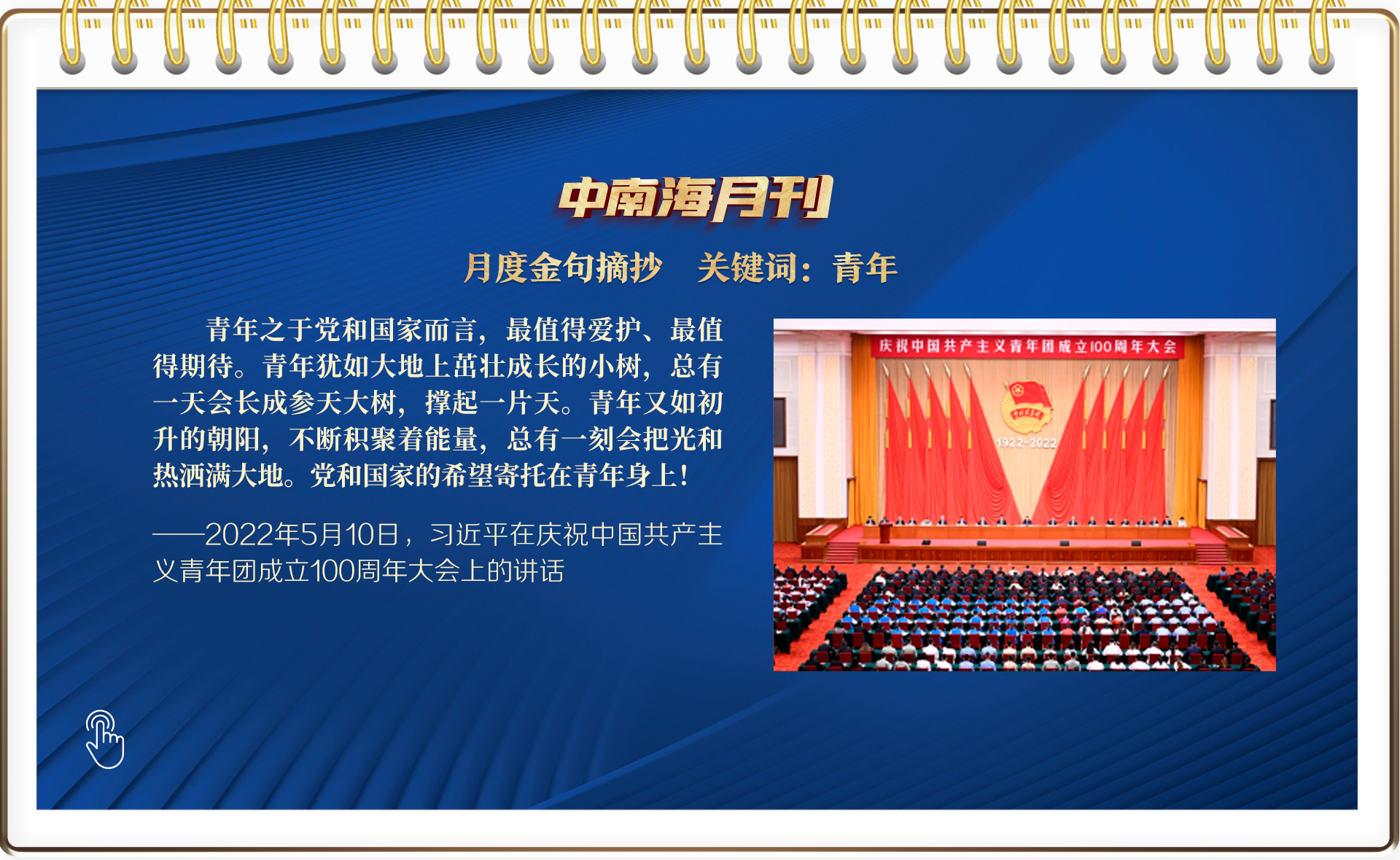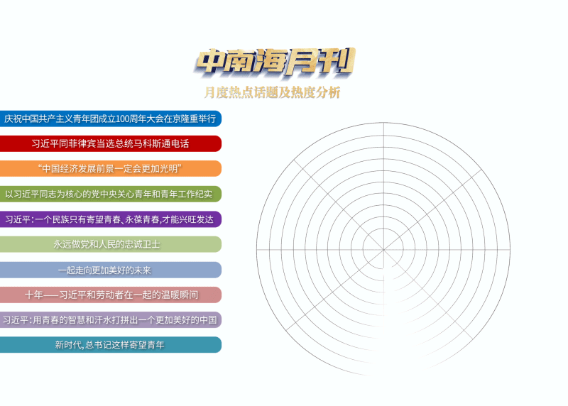 央视网“智闻”系统提取分析了2022年5月全网时政新闻热点,庆祝中国共产主义青年团成立100周年大会备受网友关注,与之关联的“以习近平同志为核心的党中央关心青年和青年工作纪实”“用青春的智慧和汗水打拼出一个更加美好的中国”“新时代,总书记这样寄望青年”等话题热度很高。