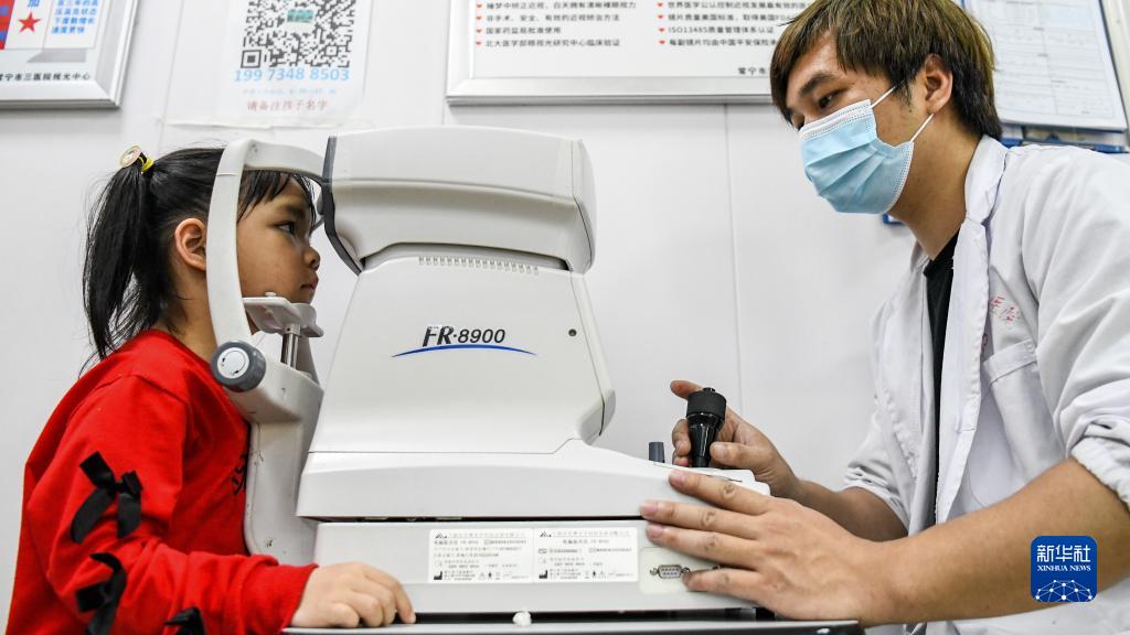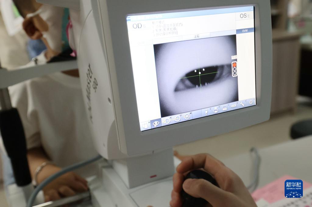 6月5日,湖南省常宁市第三人民医院的医护人员在为小朋友验光。新华社发(周秀鱼春 摄)