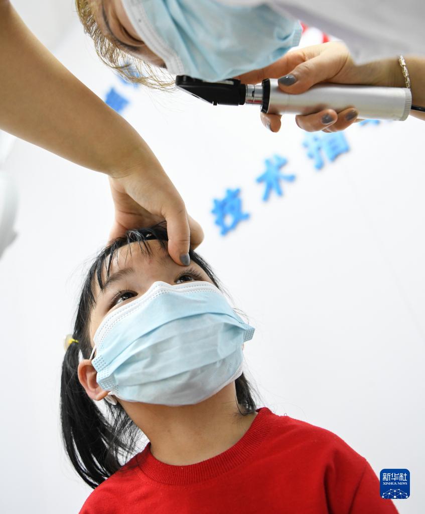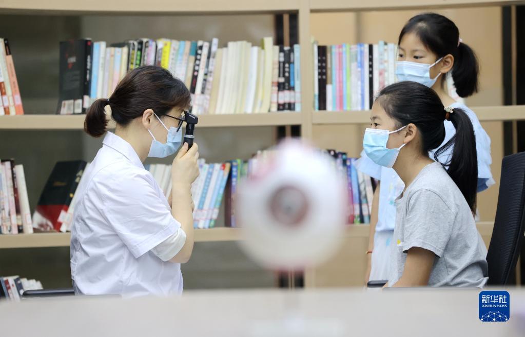 6月5日,在浙江省湖州市德清县武康街道新丰未来社区,医务人员为社区儿童检查视力。新华社发(谢尚国 摄)