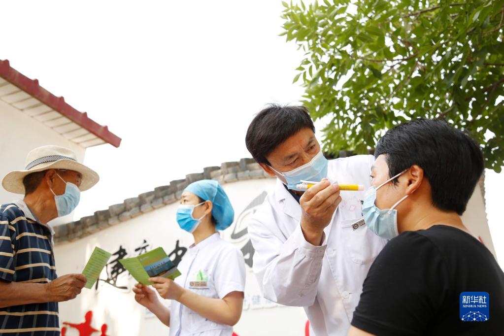 6月5日,河北省邢台市南和区人民医院医务人员深入乡村开展基层义诊活动,为贾宋镇苏史张村村民检查眼睛。新华社发(张驰 摄)