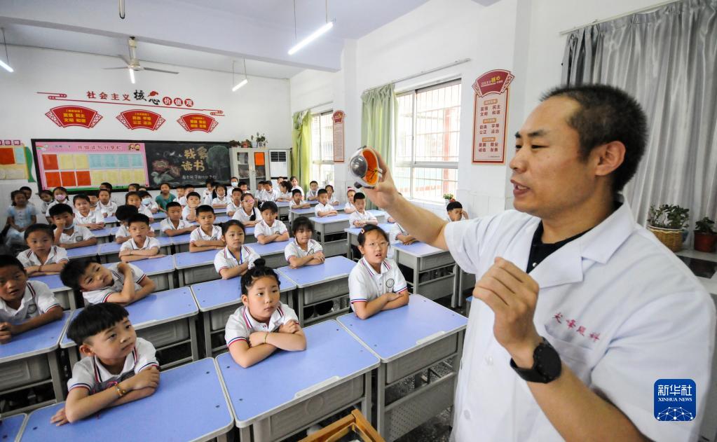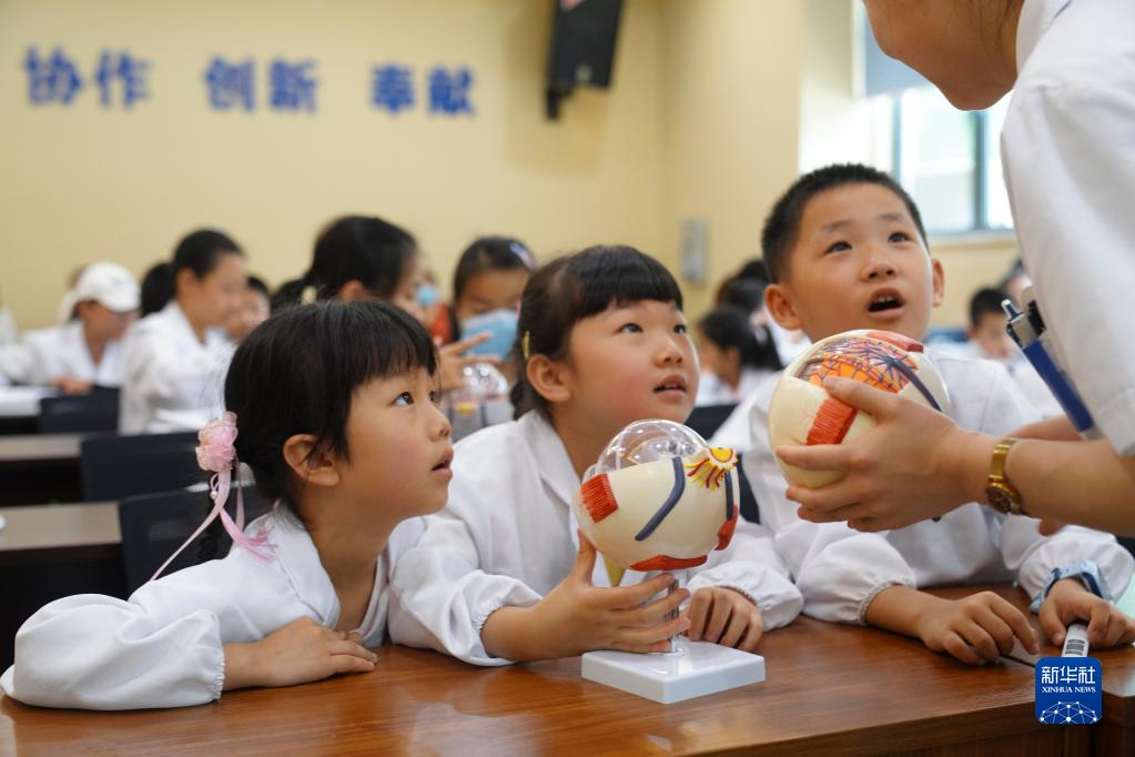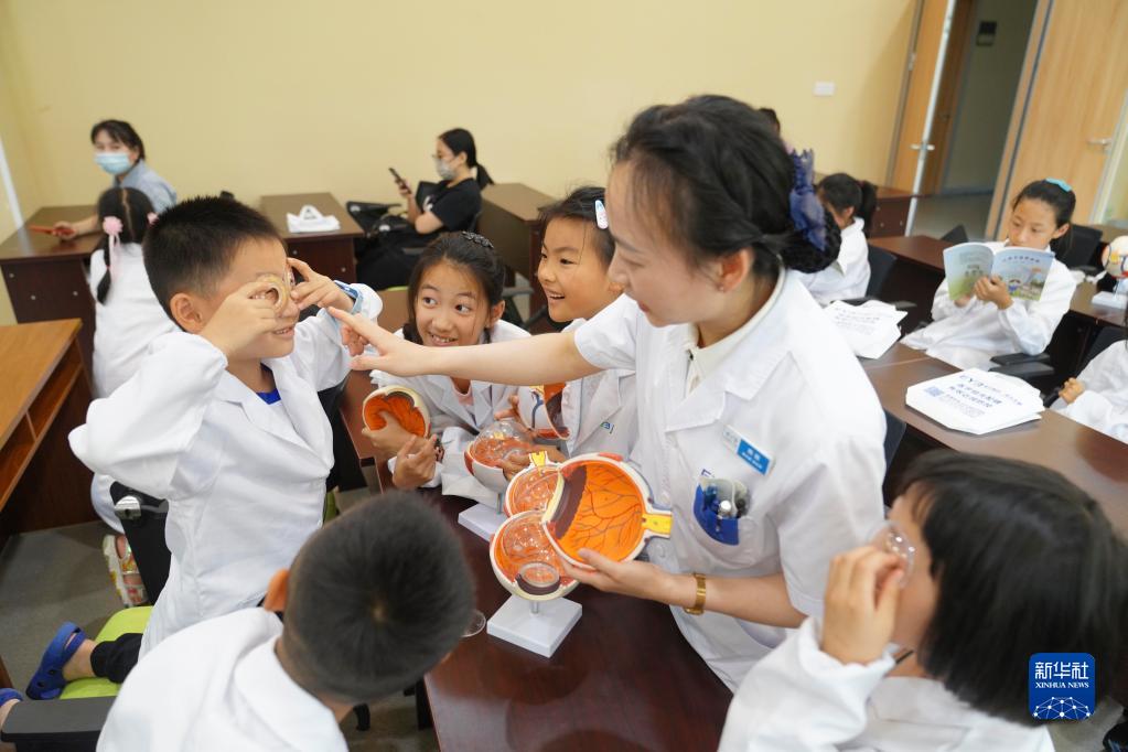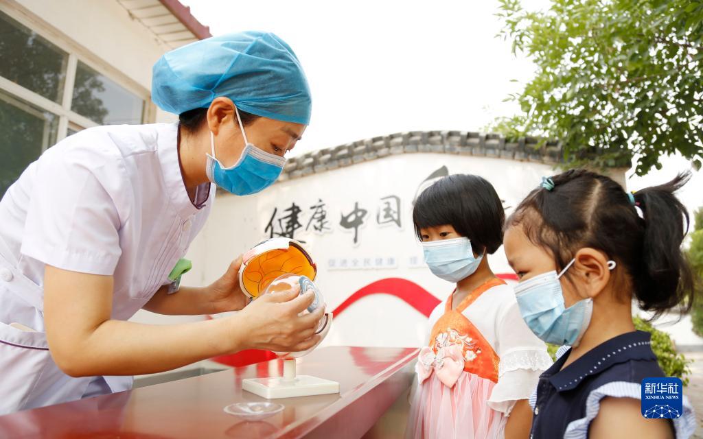 6月5日,河北省邢台市南和区人民医院医务人员深入乡村开展基层义诊活动,为贾宋镇苏史张村小朋友讲解眼睛的结构和功能。新华社发(张驰 摄)
