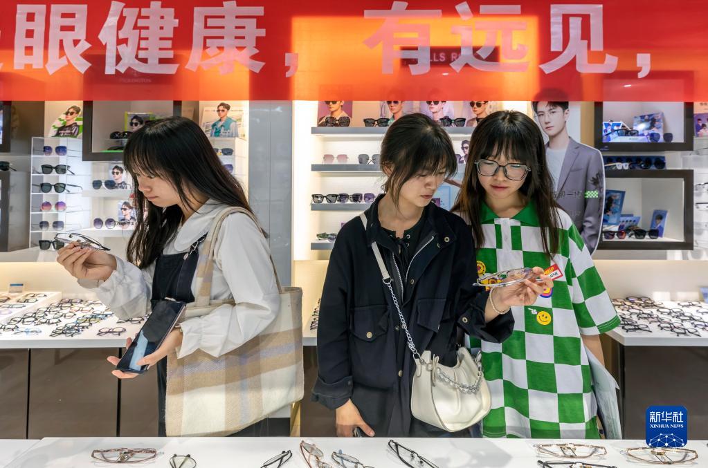 6月5日,学生在贵州省黔西市一家眼镜店内选配眼镜。新华社发(范晖 摄)