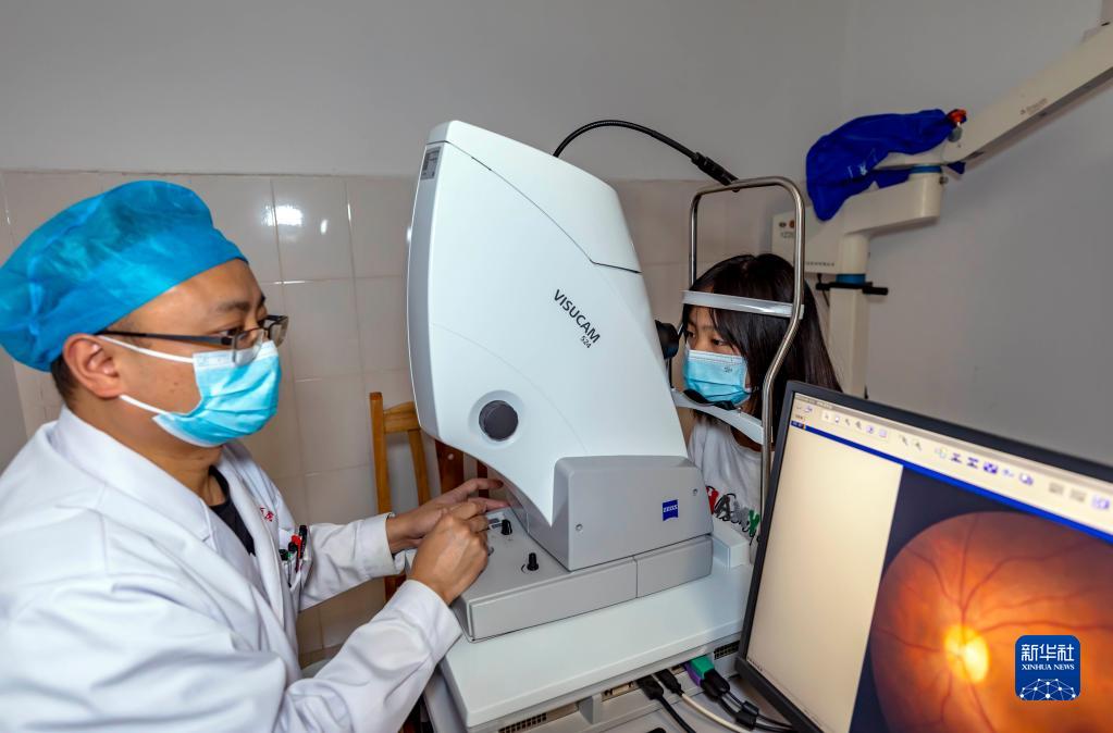 6月5日,湖南省常宁市第三人民医院的医护人员在为小朋友进行眼部检查。新华社发(周秀鱼春 摄)
