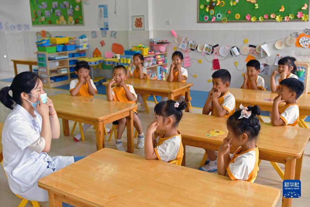 6月5日,在山东省烟台市福山区一家幼儿园,医务人员指导小朋友做眼保健操。新华社发(孙文潭 摄)
