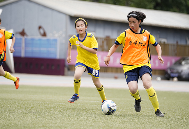 清华附小举行的第十届“马约翰杯”足球联赛,女生在比赛中拼抢。(资料图片)(受访者供图)