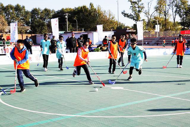 2021年10月17日,北京举行中小学生旱地冰球比赛,图为参赛学生在比赛中。新华社发(周良 摄)