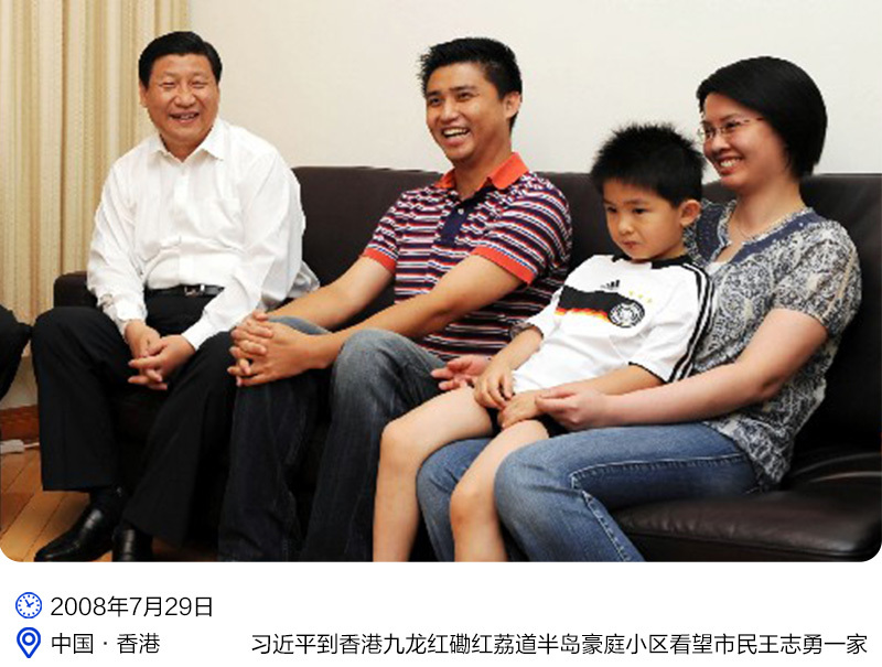 2008年7月,时任国家副主席的习近平考察香港,专门抽出时间深入普通社区。“我们都很关心香港居民的生活,所以到你家里来看看。”在市民余杜胜家,习近平细心地询问了工资福利、小区治安等问题。当听到香港市民对物价上涨感受强烈时,习近平说,价格的上涨有多种原因,解决的办法,一是政府要控制物价,二来是要发展经济,增加收入,对于低收入的群体要多些支持和帮助。