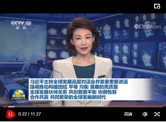 习近平发表题为《构建高质量伙伴关系 共创全球发展新时代》的重要讲话。