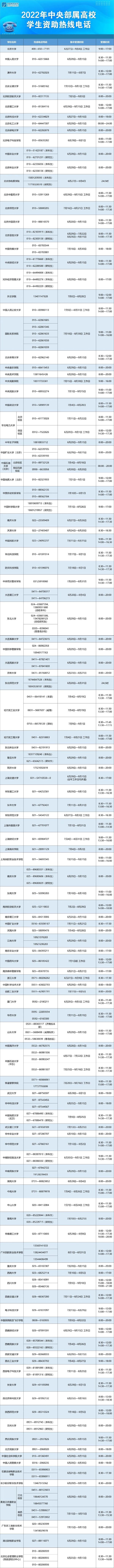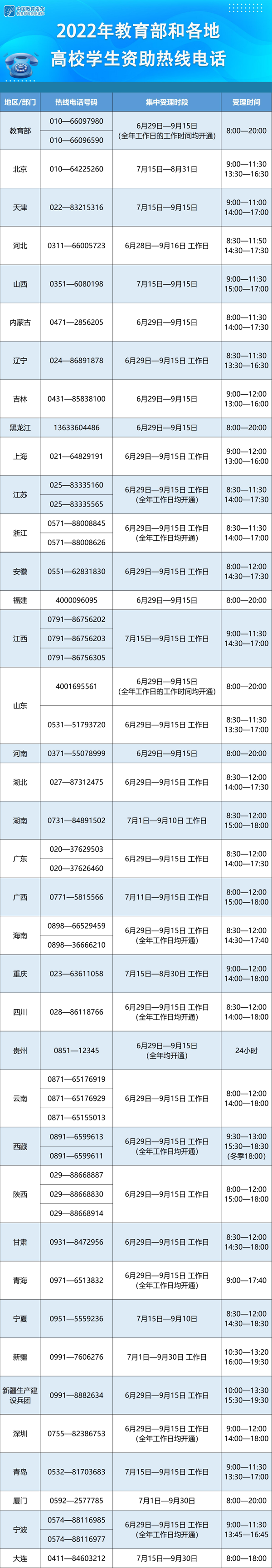 教育部要求各省(区、市)及所属高校、中央高校学生资助管理部门均开通热线电话,并结合实际情况自行确定集中受理时段和具体受理时间。