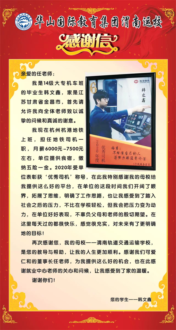 安置到杭港地铁司机的我校优秀毕业生韩文鑫,籍贯甘肃,月薪8000千以上