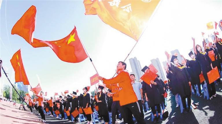 长安大学毕业典礼上,同学们高举五星红旗。长安大学供图