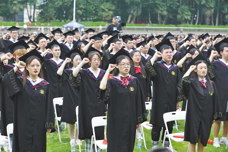 西安交通大学毕业典礼上,同学们庄严宣誓,表达了把青春奋斗融入党和人民事业的坚定决心。西安交通大学供图
